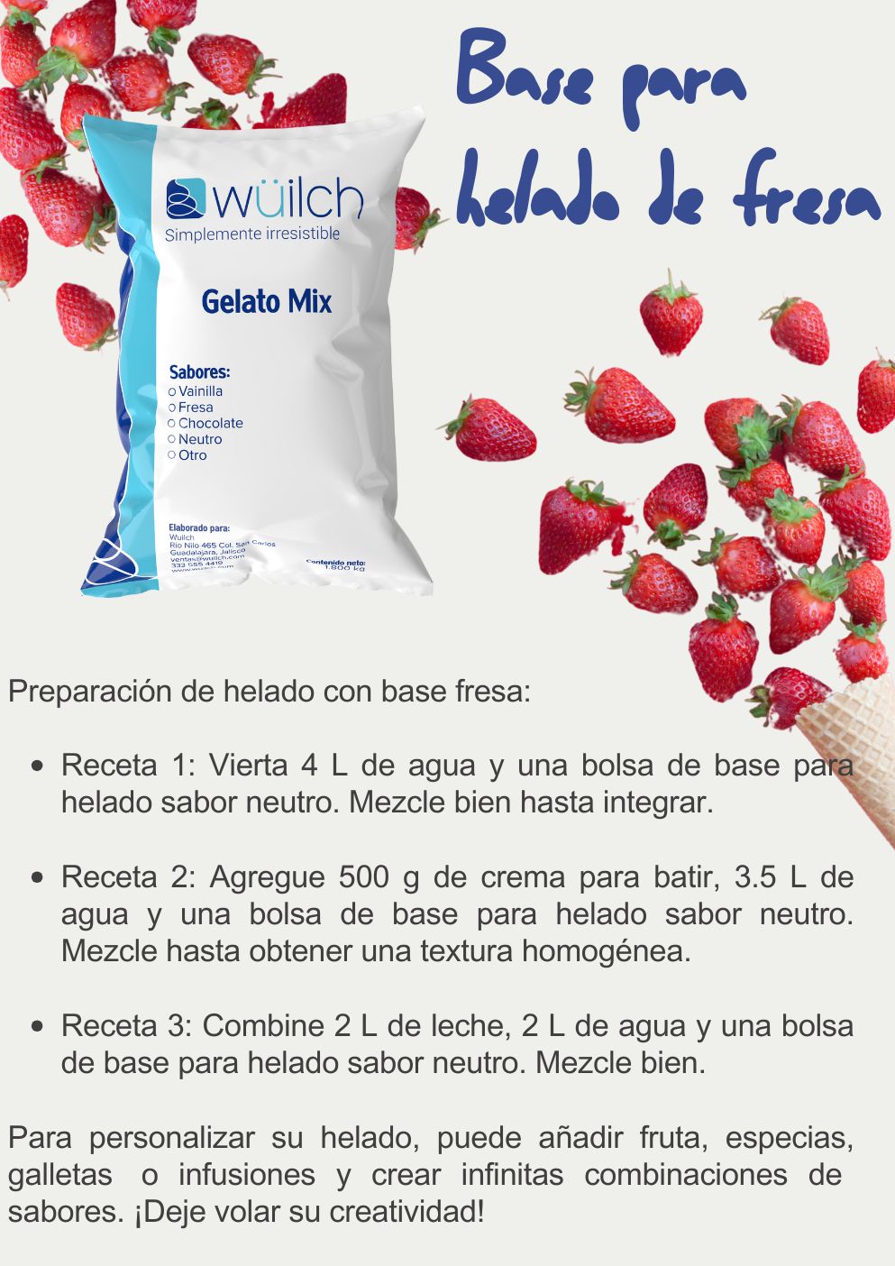 Base para helado de crema, sabor fresa. Marca Wuilch.